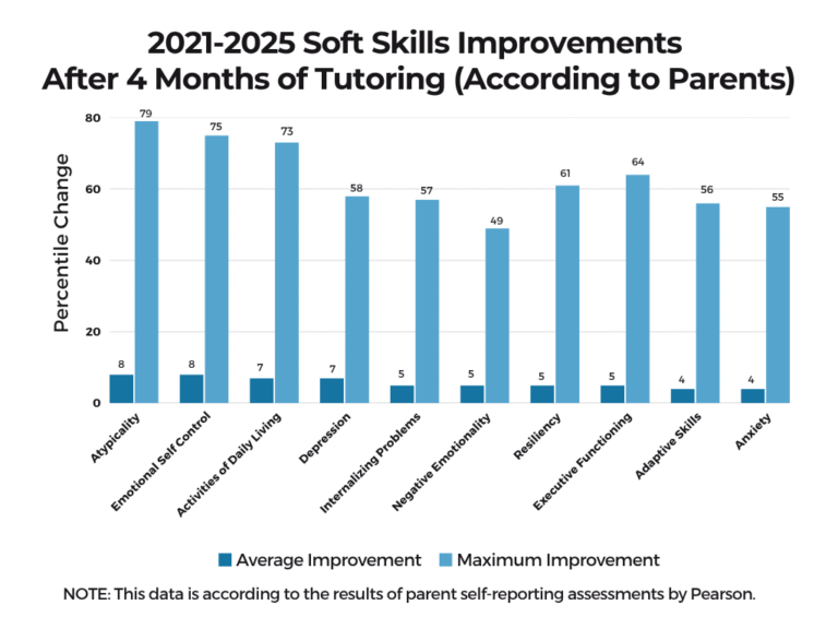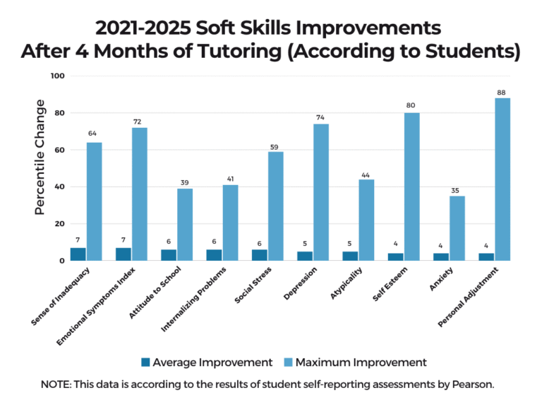 Using reputable, standards-aligned pre- and post-assessments, we have been able to quantify our students’ astounding growth as a result of our tutoring program. In a matter of mere months, our students have improved the equivalent of years in core subjects. With our high-quality tutoring sessions intertwined with strategies to enhance interpersonal and self-management skills, our students have also shown improvement in essential soft skills.